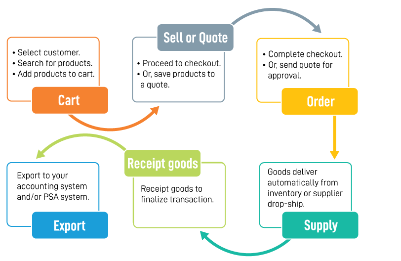 The following diagram illustrates the basic workflow of a Datto Commerce transaction, from selling products to exporting information into your process apps.