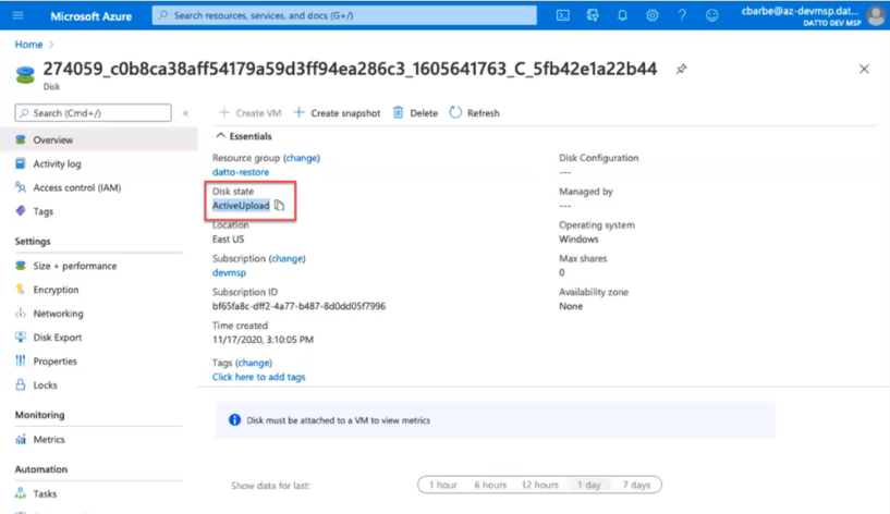 4. Under the Disk State heading, you can watch the disk status change as the restore processes. The status will show as ActiveUpload while the system transfers data. Once the restore is complete and ready for access, this status will show as Attached. Click the VM name will appear under the Managed By heading to access the VM.