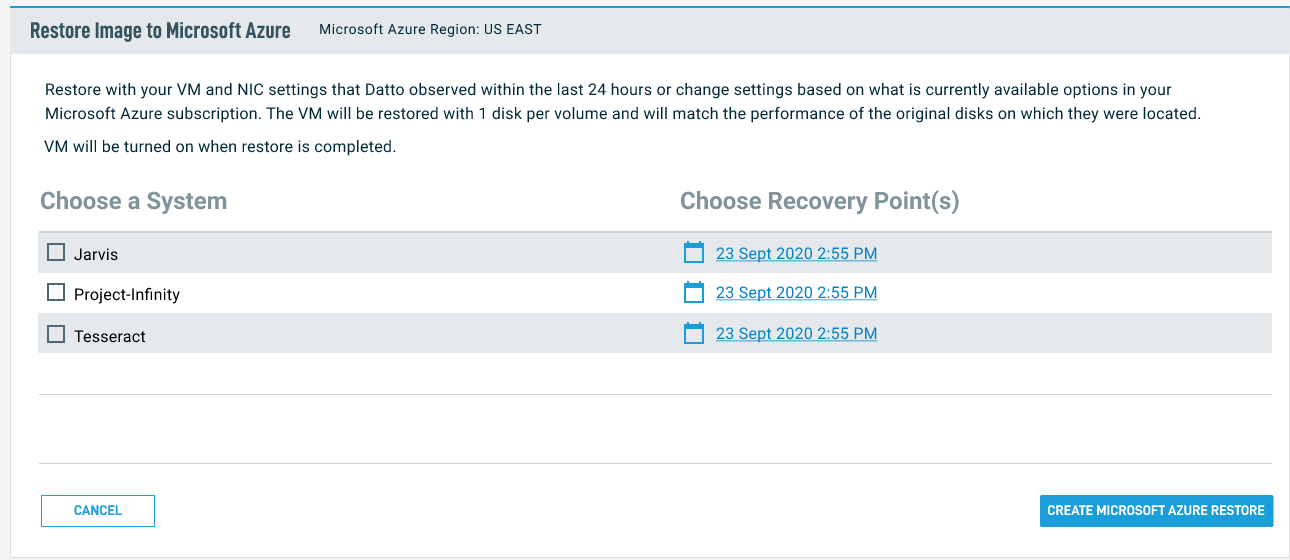2. Select the system from which you would like to restore, then click the calendar icon to choose a restore date and time. After making your selection, click the CREATE MICROSOFT AZURE RESTORE button.