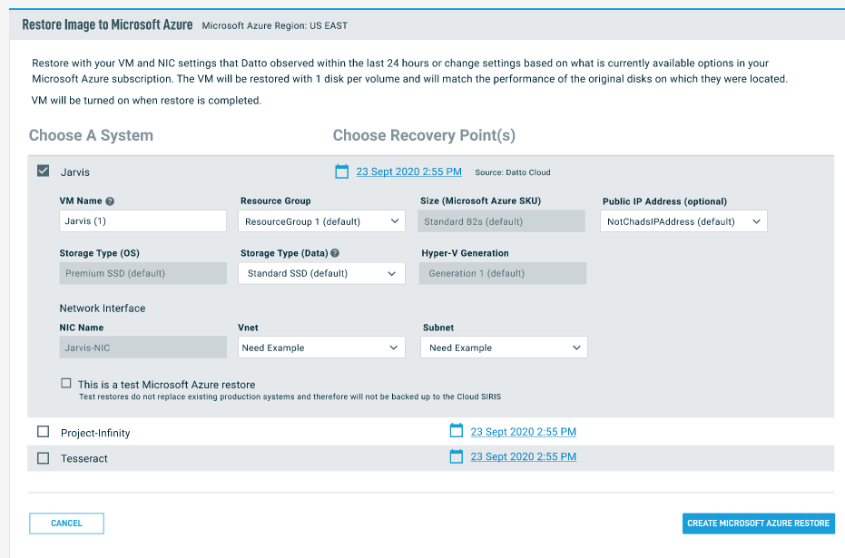 The Restore Image to Microsoft Azure restore method unique to the Datto Cloud SIRIS creates a separate VM resource.