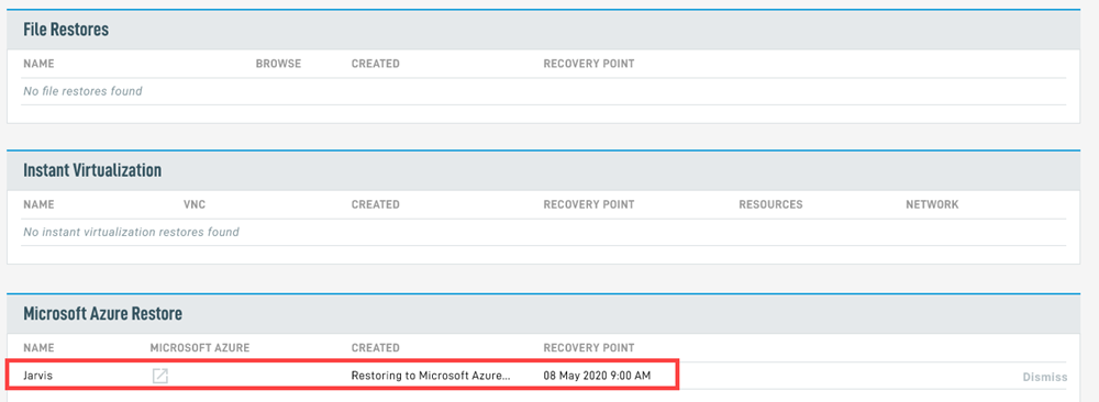 1. In the Recovery Launchpad, click the Dismiss link. This action causes the Cloud SIRIS to destroy any referential data to the CLOUD SIRIS-protected system dataset; it does not destroy the restore VM in your Microsoft Azure environment.